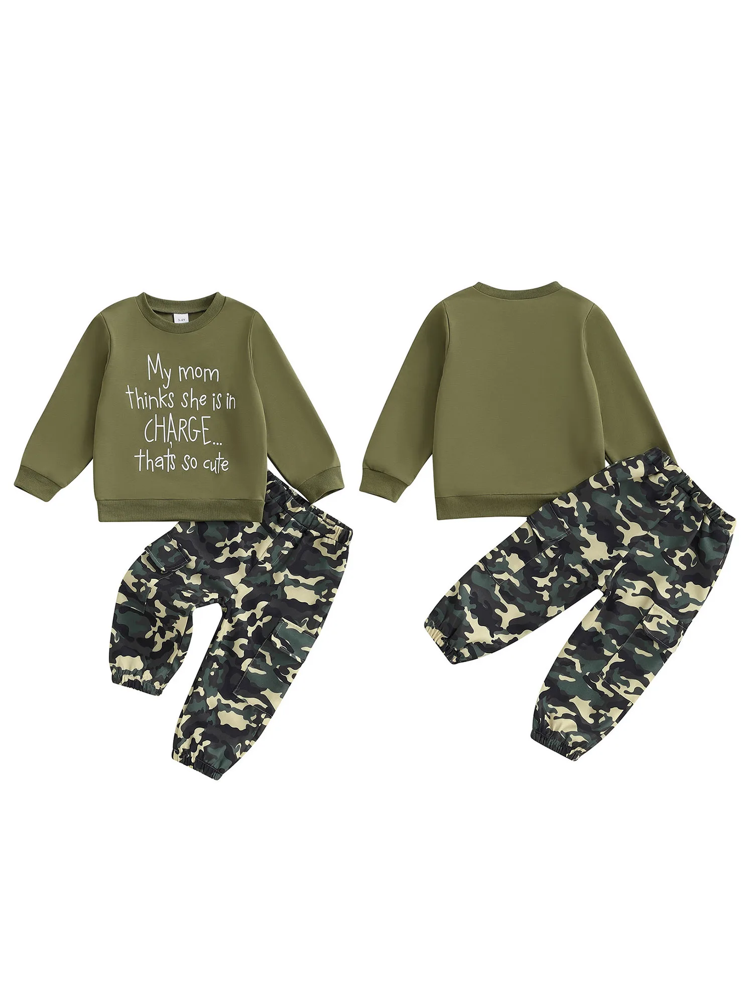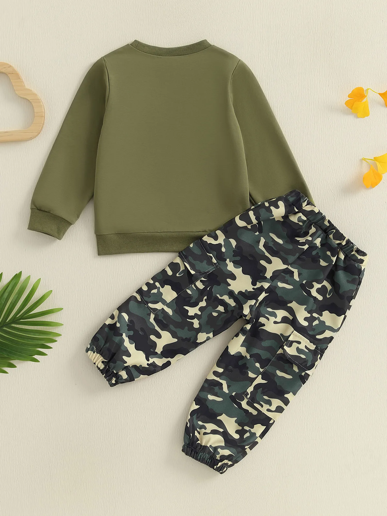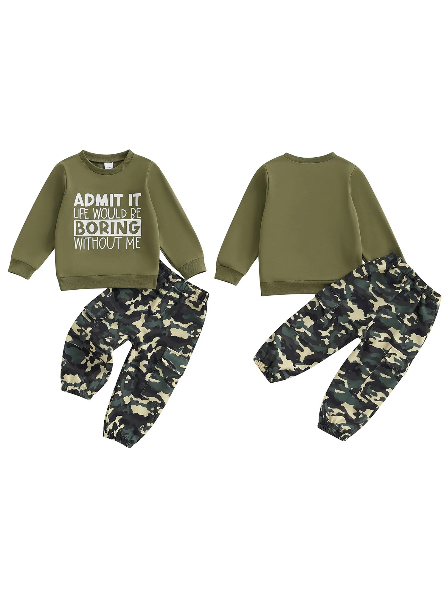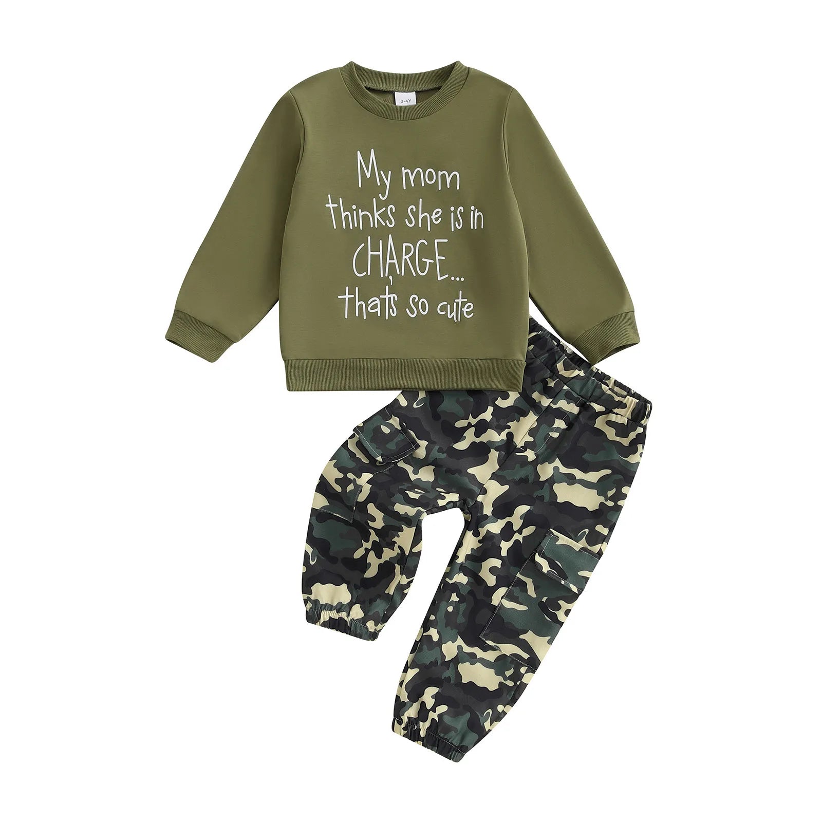 Toddler Little Boy Winter Fall Outfit Letter Print Long Sleeve Sweatshirt Camo Cargo Pants 2 Piece SetSize (cm)
