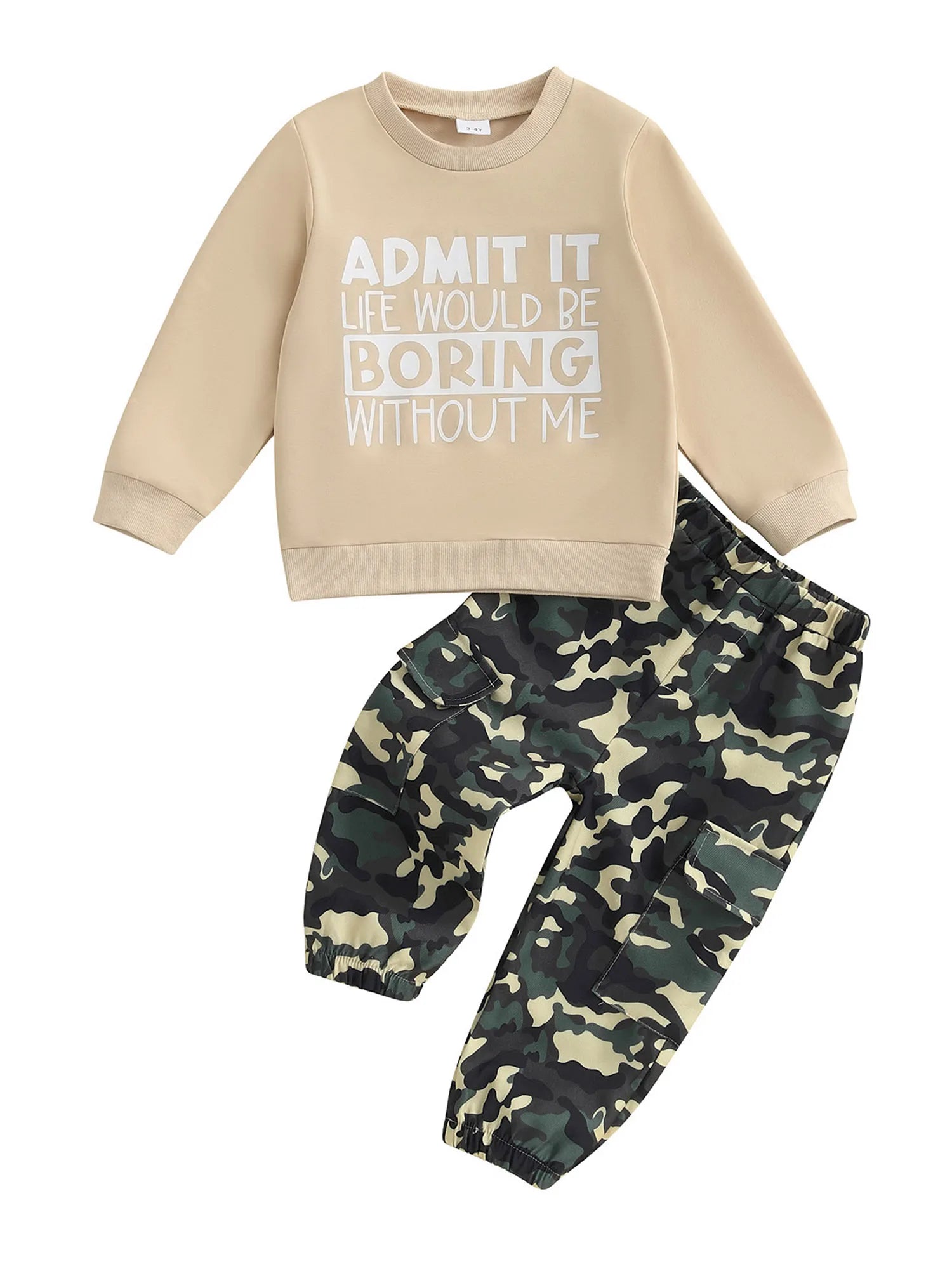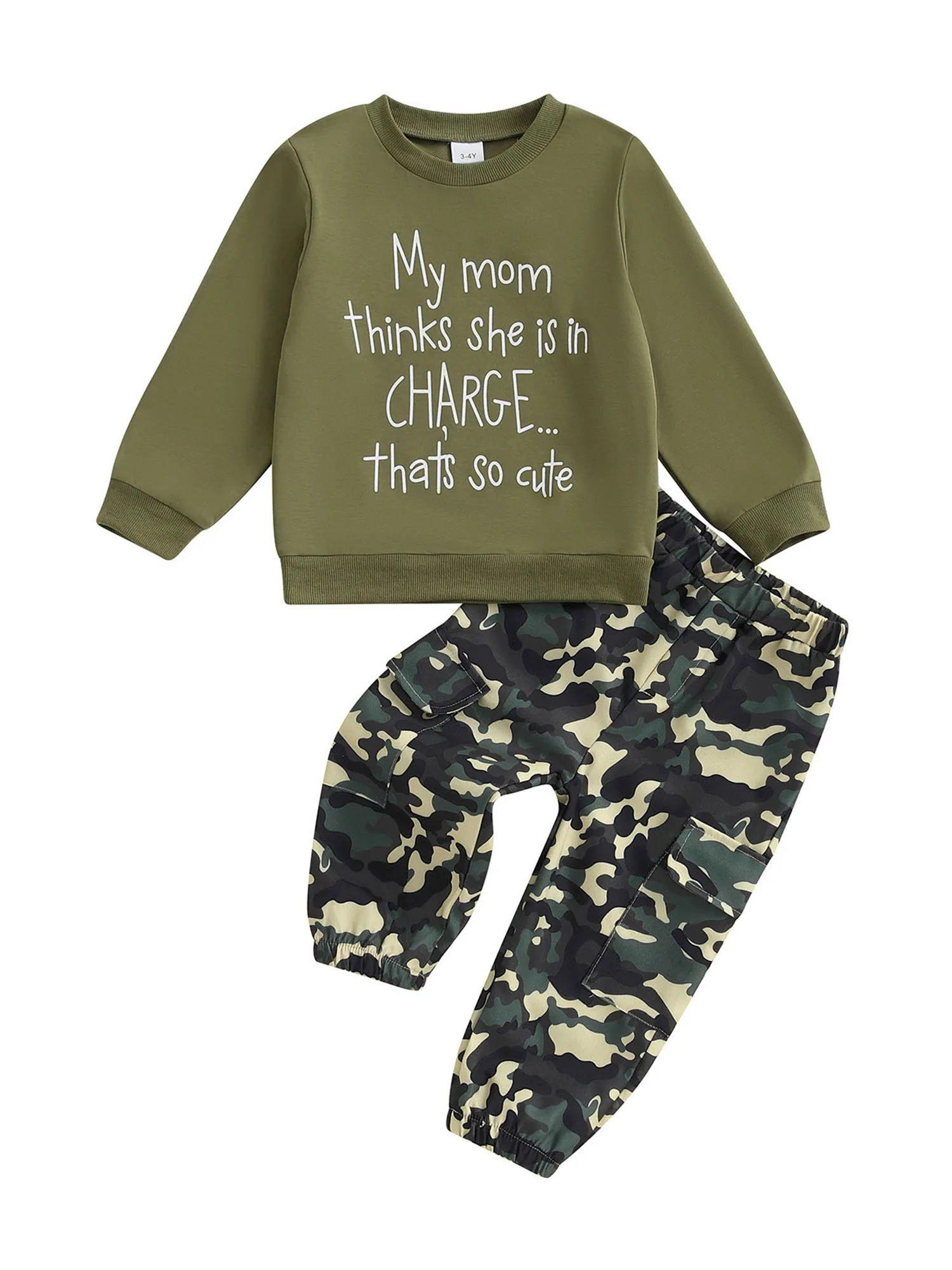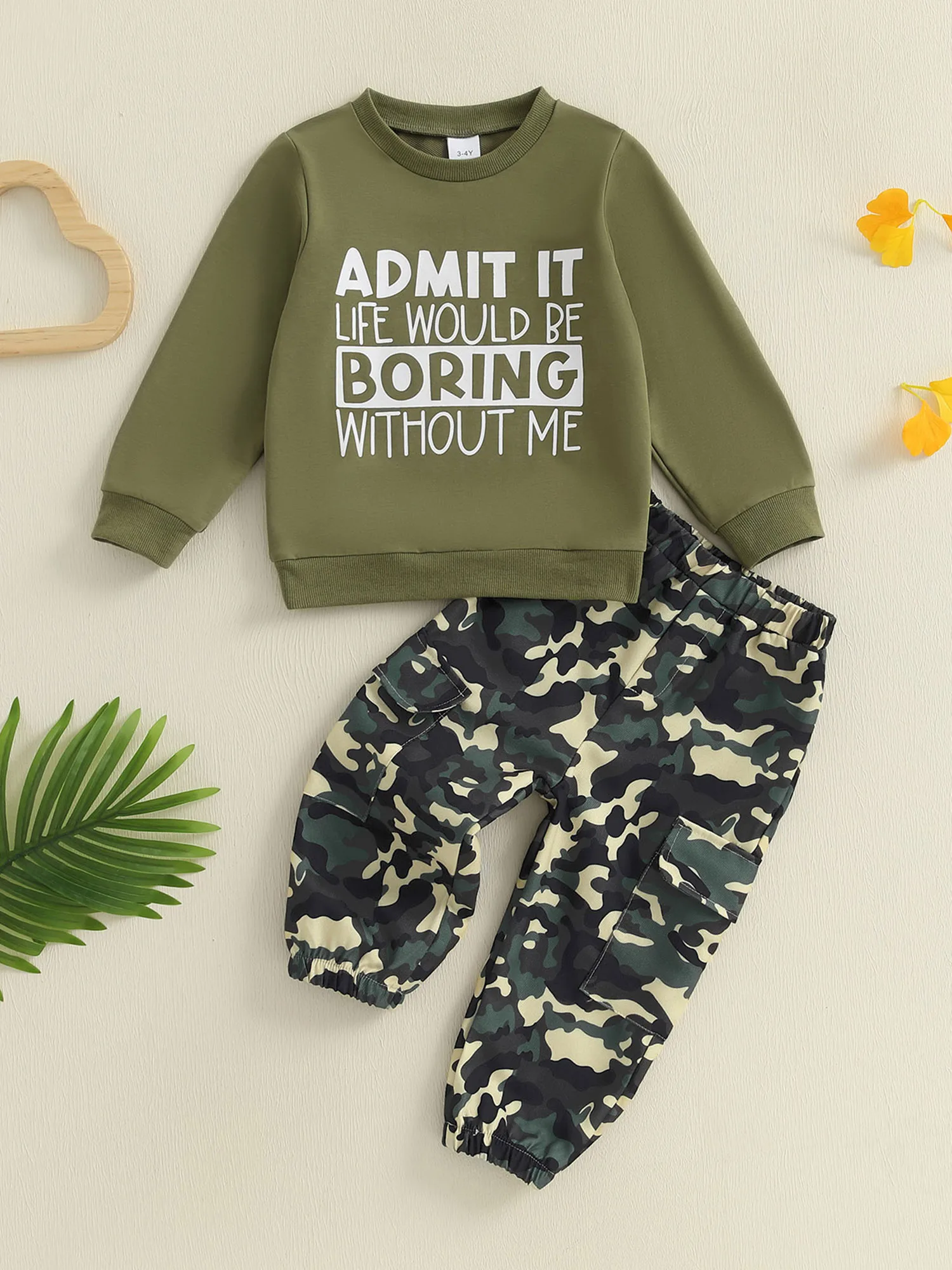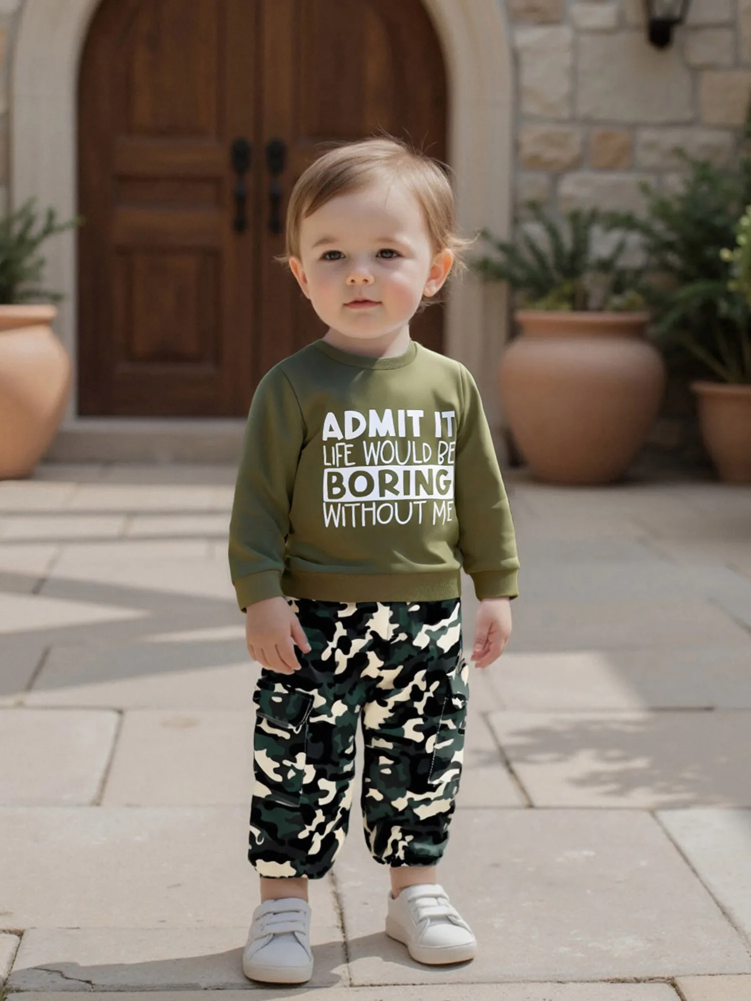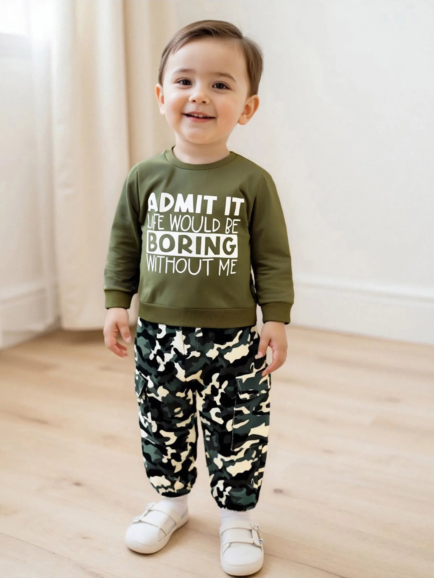 Toddler Little Boy Winter Fall Outfit Letter Print Long Sleeve Sweatshirt Camo Cargo Pants 2 Piece SetSize (cm)