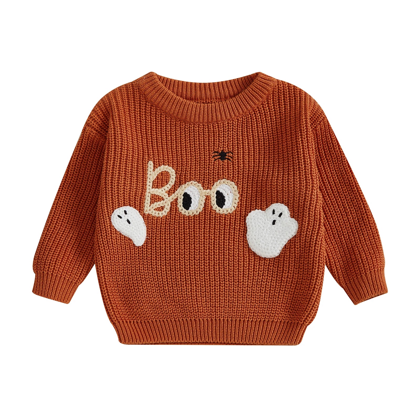 Baby Halloween Sweater Letter Ghost Embroidery Ribbed Crew Neck Long Sleeve Knitted Tops for Fall