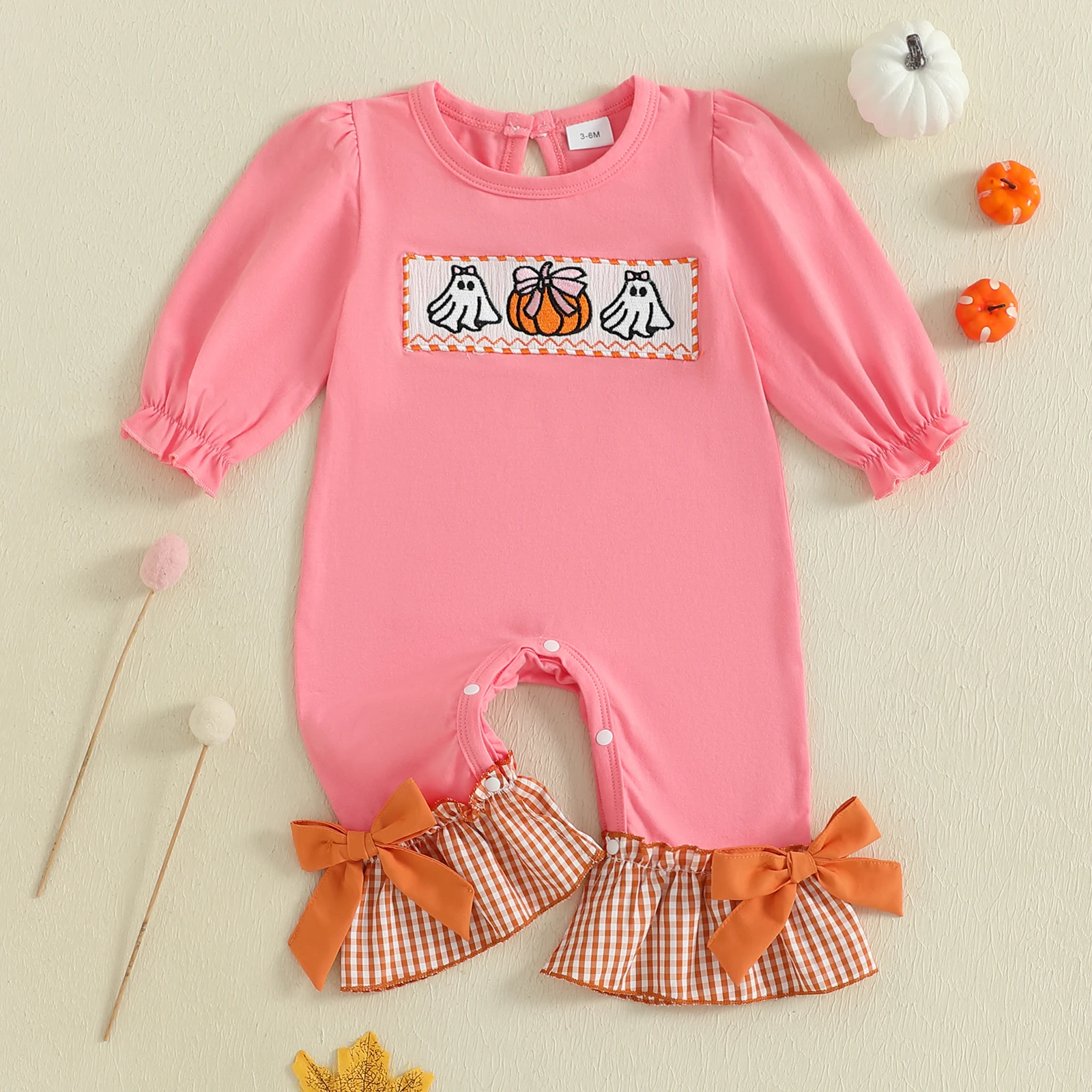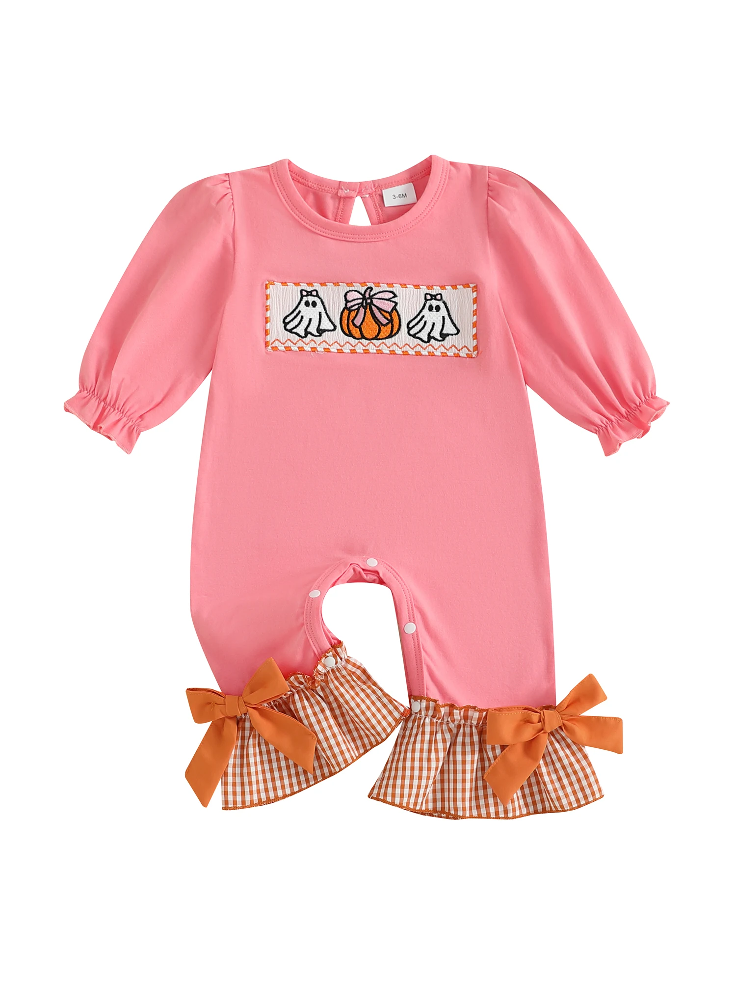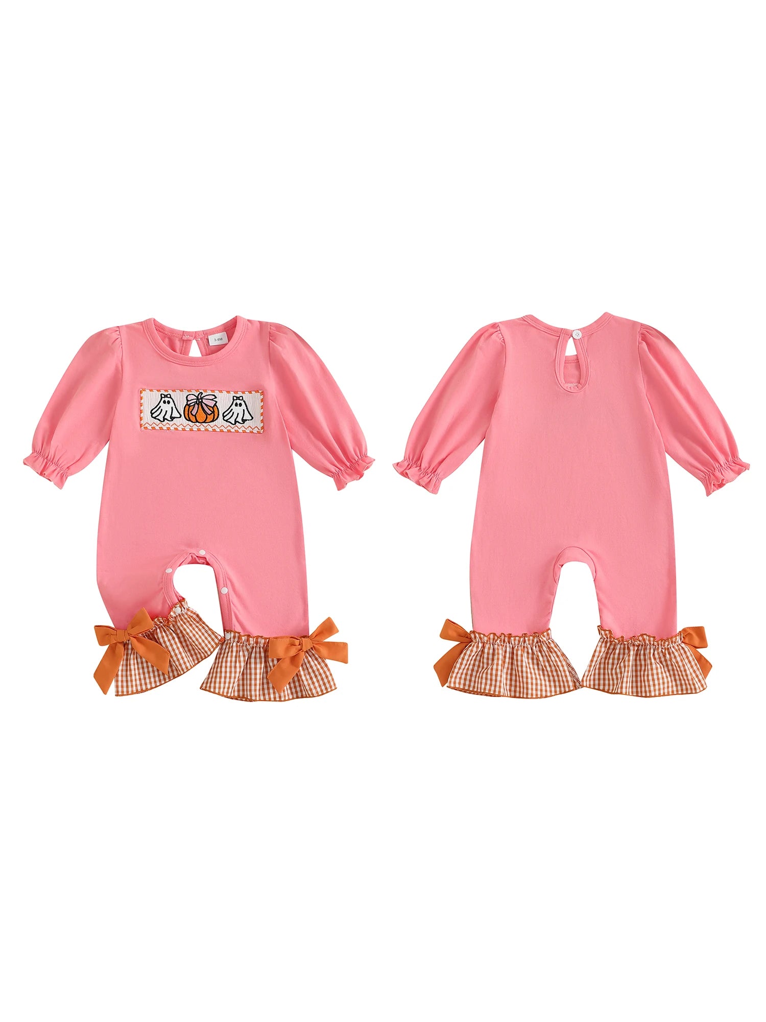Infant Girls Halloween Romper with Spooky Ghost and Pumpkin Embroidery Long Sleeve Plaid Jumpsuit with Flare Cuffs