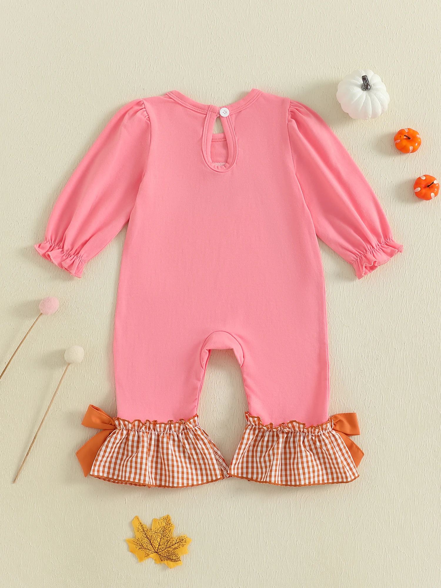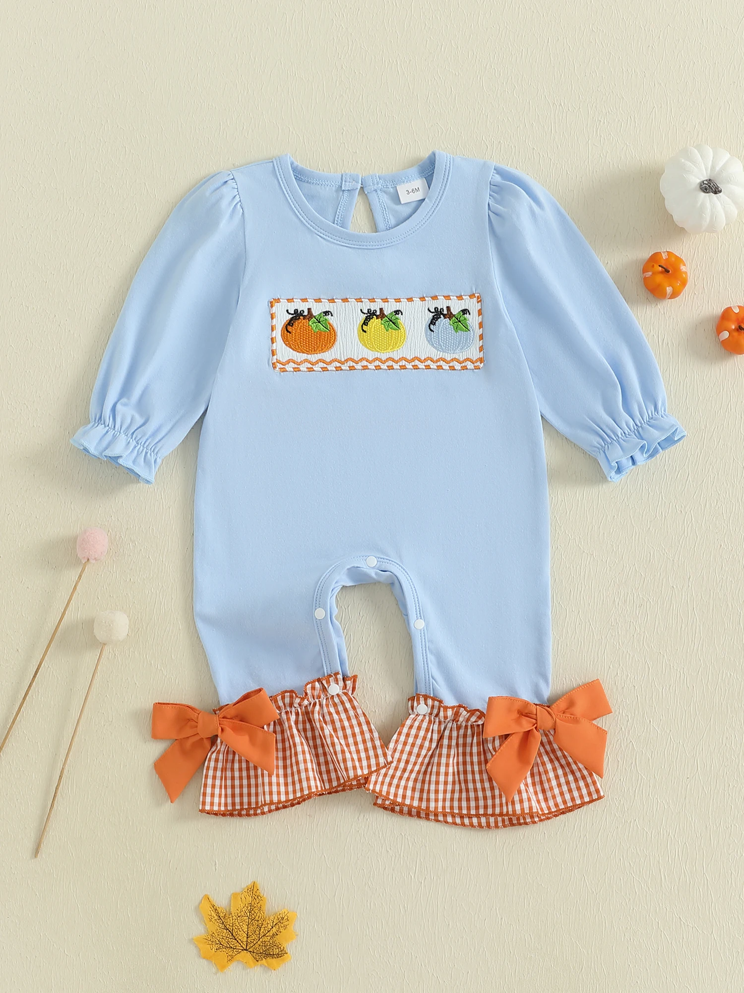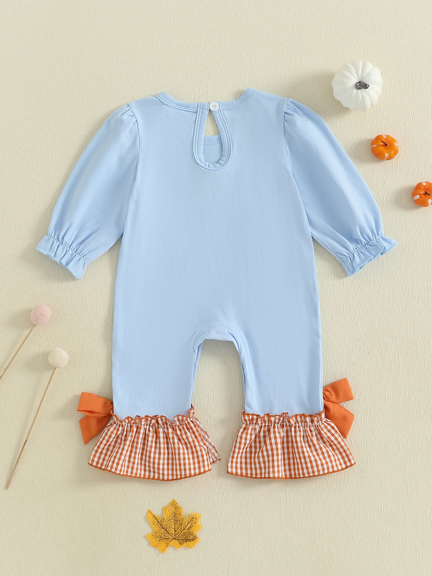 Infant Girls Halloween Romper with Spooky Ghost and Pumpkin Embroidery Long Sleeve Plaid Jumpsuit with Flare Cuffs