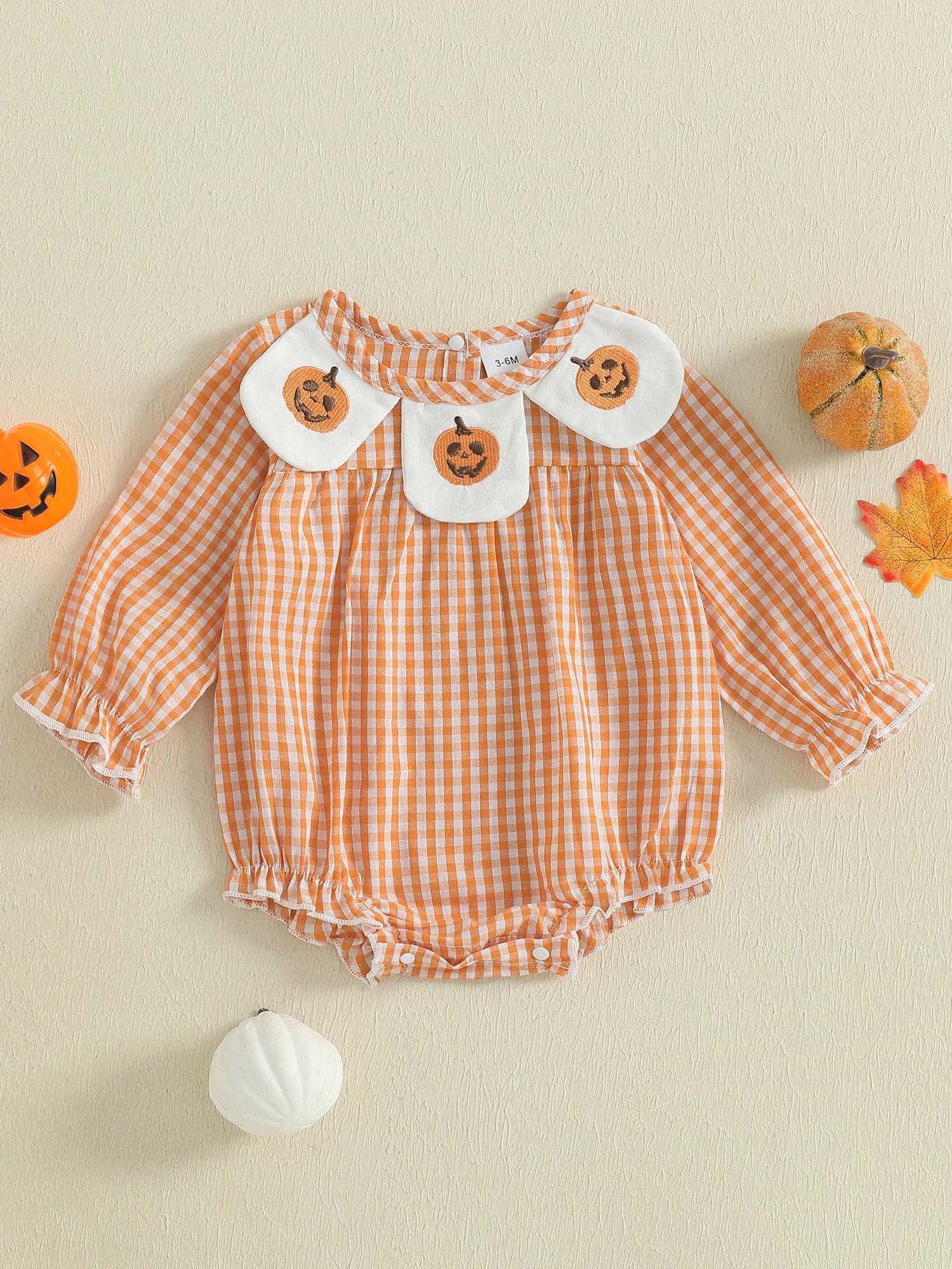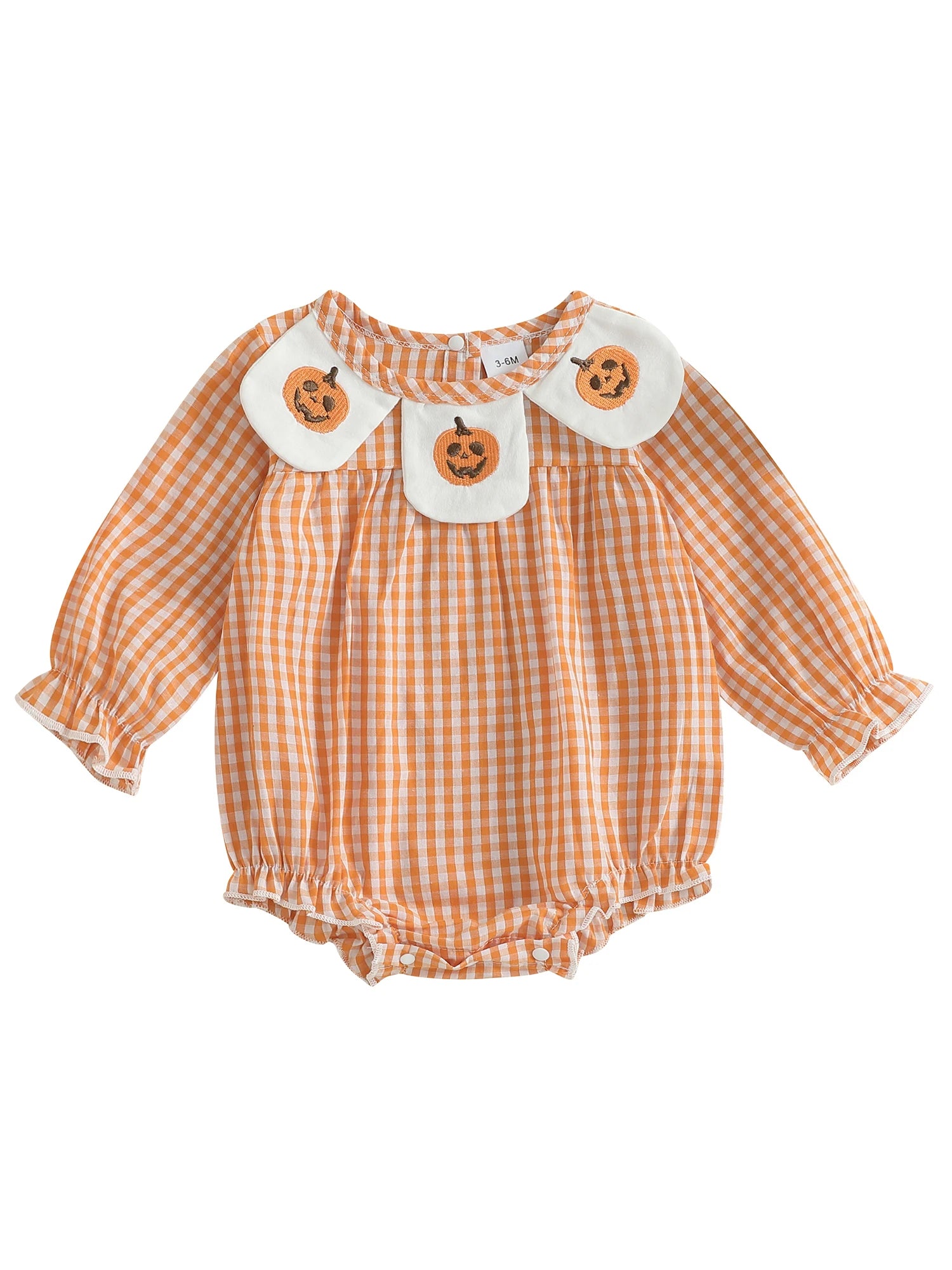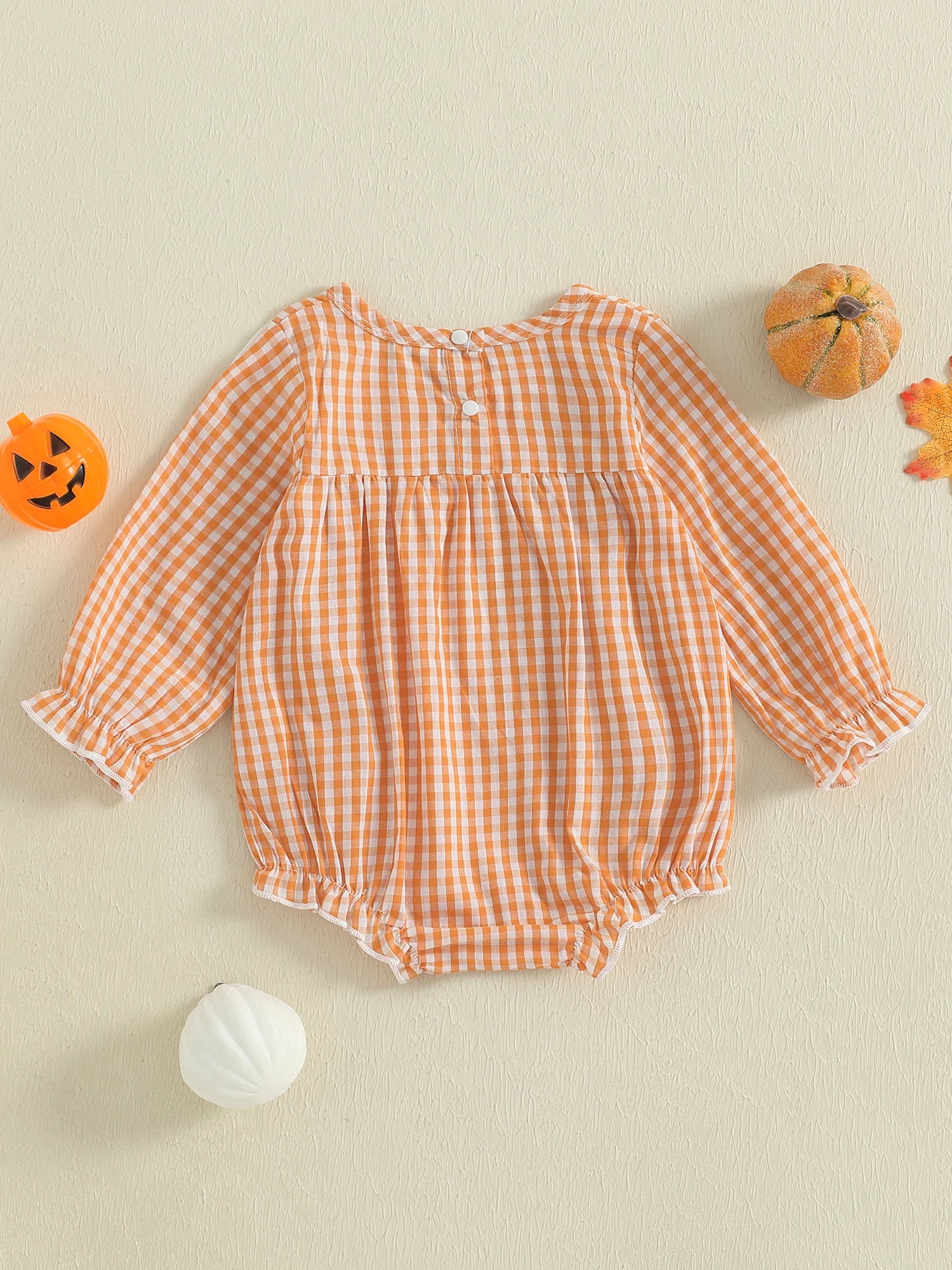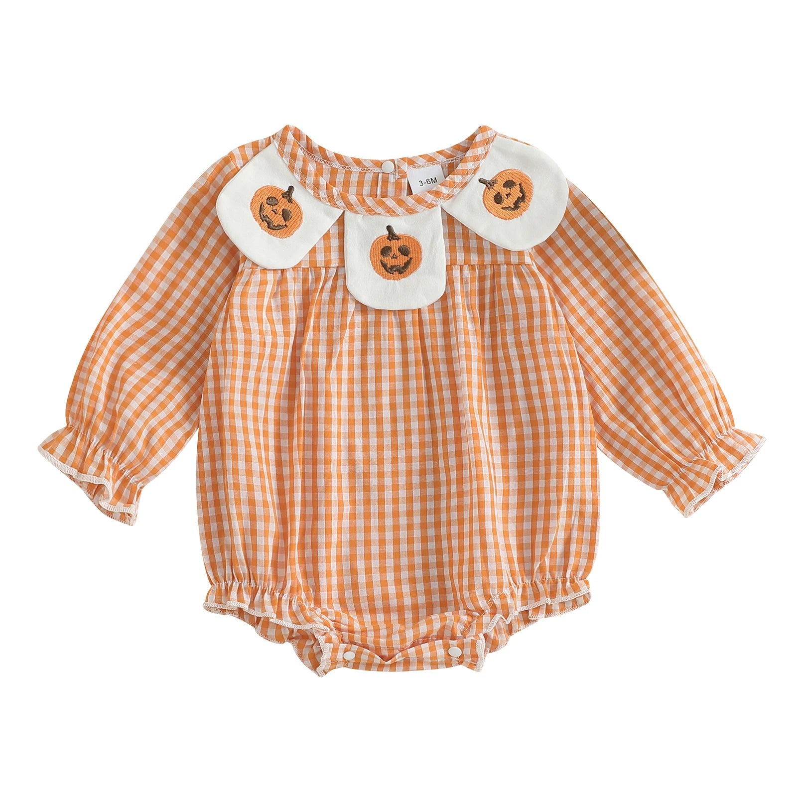 Baby Girls Rompers Halloween Clothes Pumpkin Embroidery Plaid Long Sleeve Bodysuits Jumpsuits